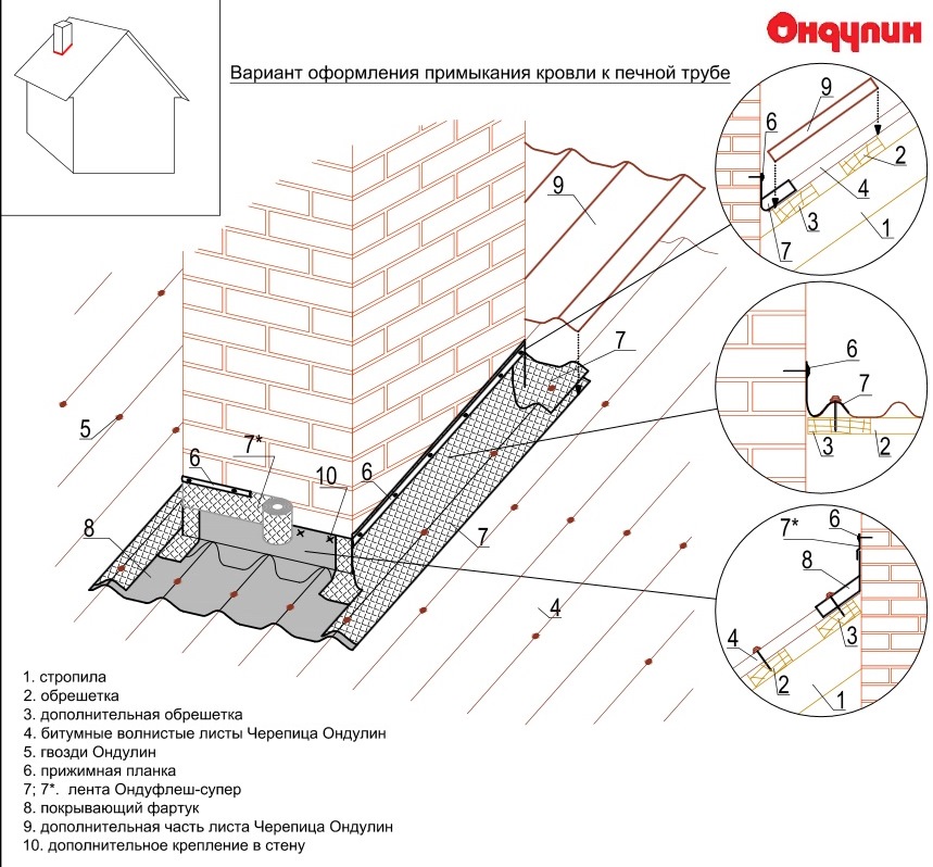 При монтаже низ фартука прибивается в каждую волну гвоздями Ондулин, а верх фартука проклеивается лентой Ондуфлеш-Супер шириной не менее 10 см.