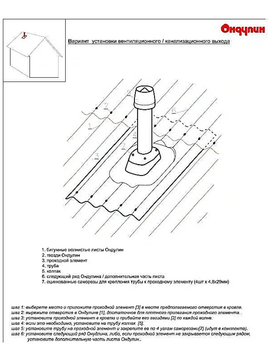 подходит для кровель с уклоном 9-55°, верхний и нижний нахлёсты необходимо сделать не менее 12 см, основание (проходной элемент) закрепить гвоздями "Ондулин" по каждой волне, затем установить трубу вертикально на основание по уровню и закрепить саморезами из комплекта.